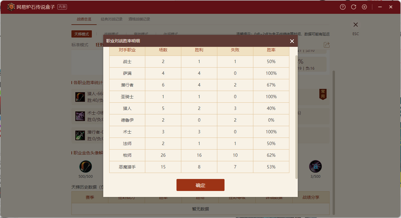 从数据能明显看出,环境中大多是牧师和瞎子。牧师以剑气双休心火牧为主,我们是劣势,但好在其他的牧师形态基本都是优势,因此对阵牧师的胜率比较可观。瞎子以海盗瞎为主,还有一部分任务瞎,整体小优,但有一把掉线以及2次失误导致胜率基本持平。对阵这两个主流职业的胜率表明了宇宙走a猎在当前环境下确实有一战之力。