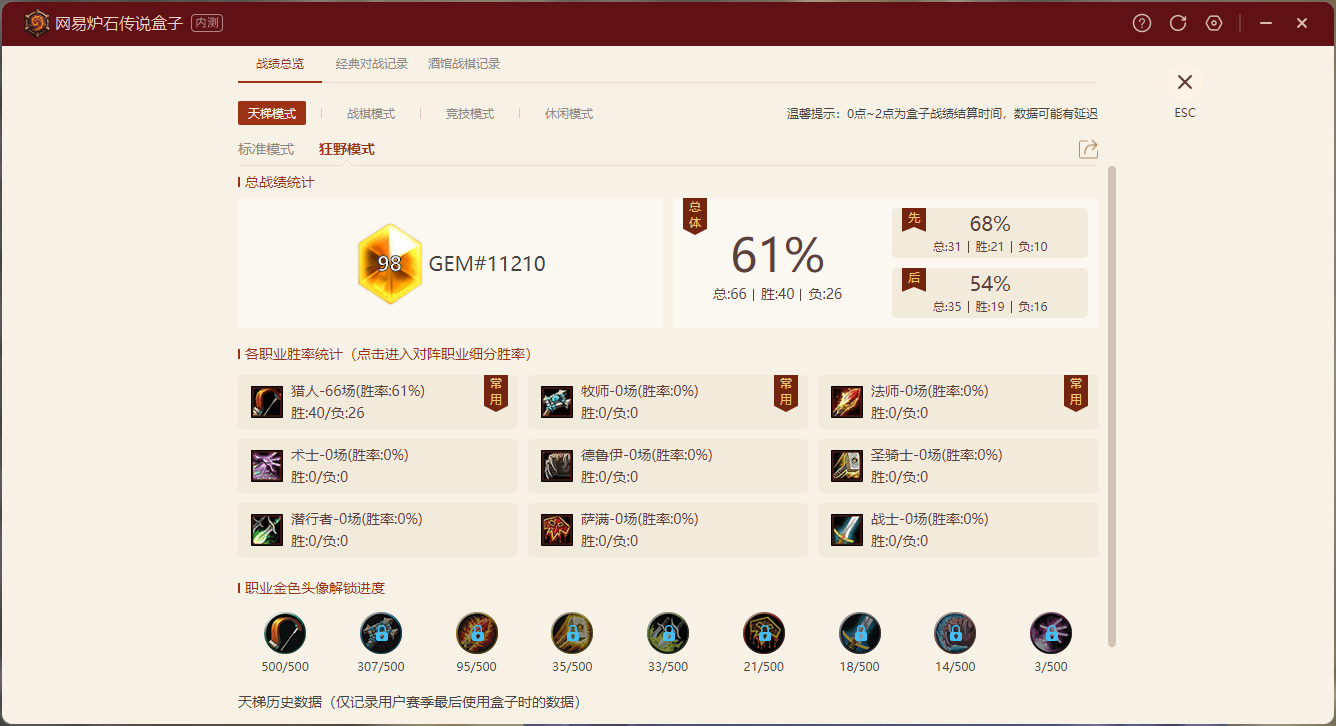 近2天的数据记录了分段从500+到前100的对局,胜率61%,战绩40-26