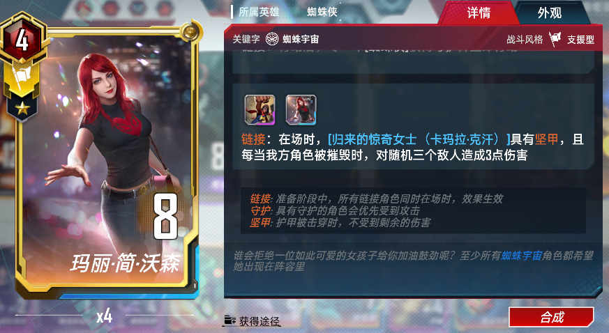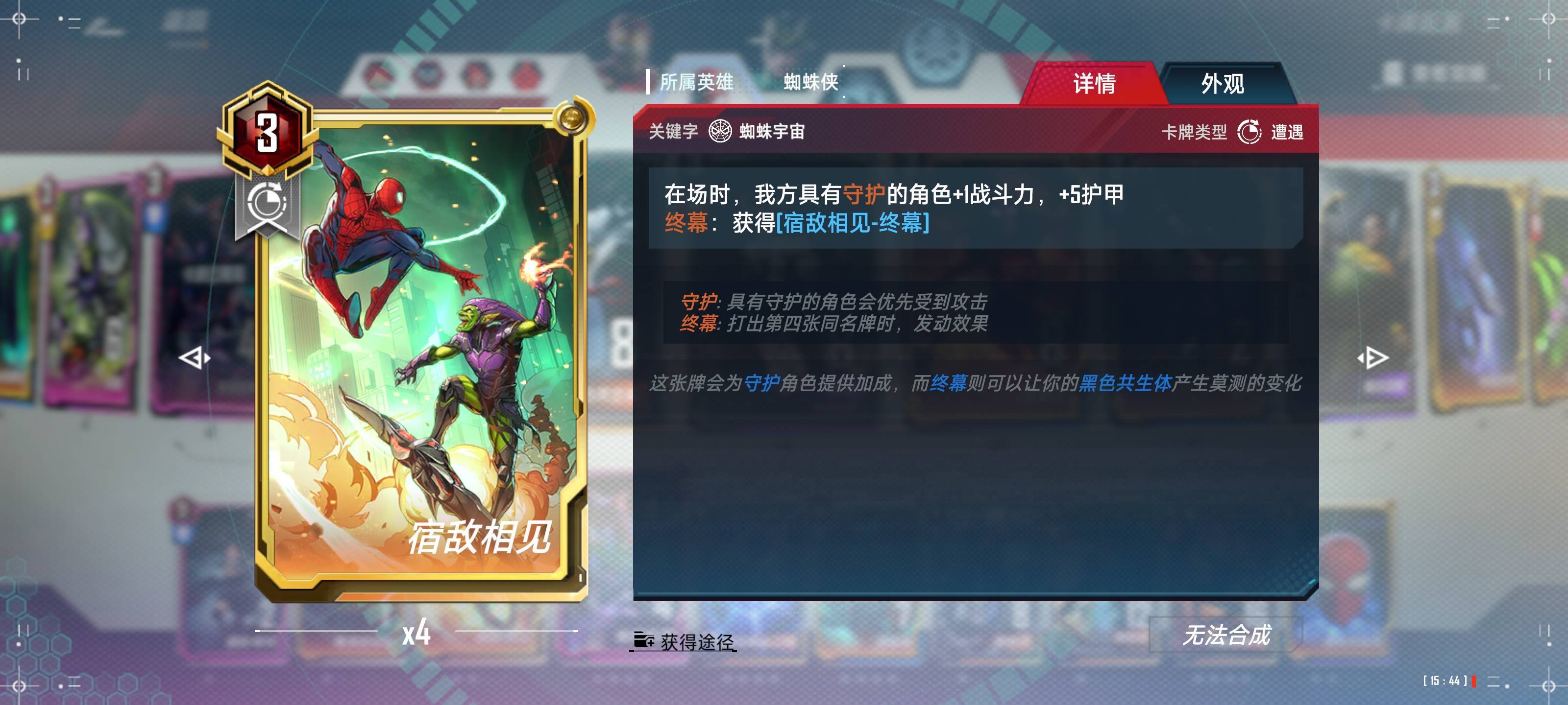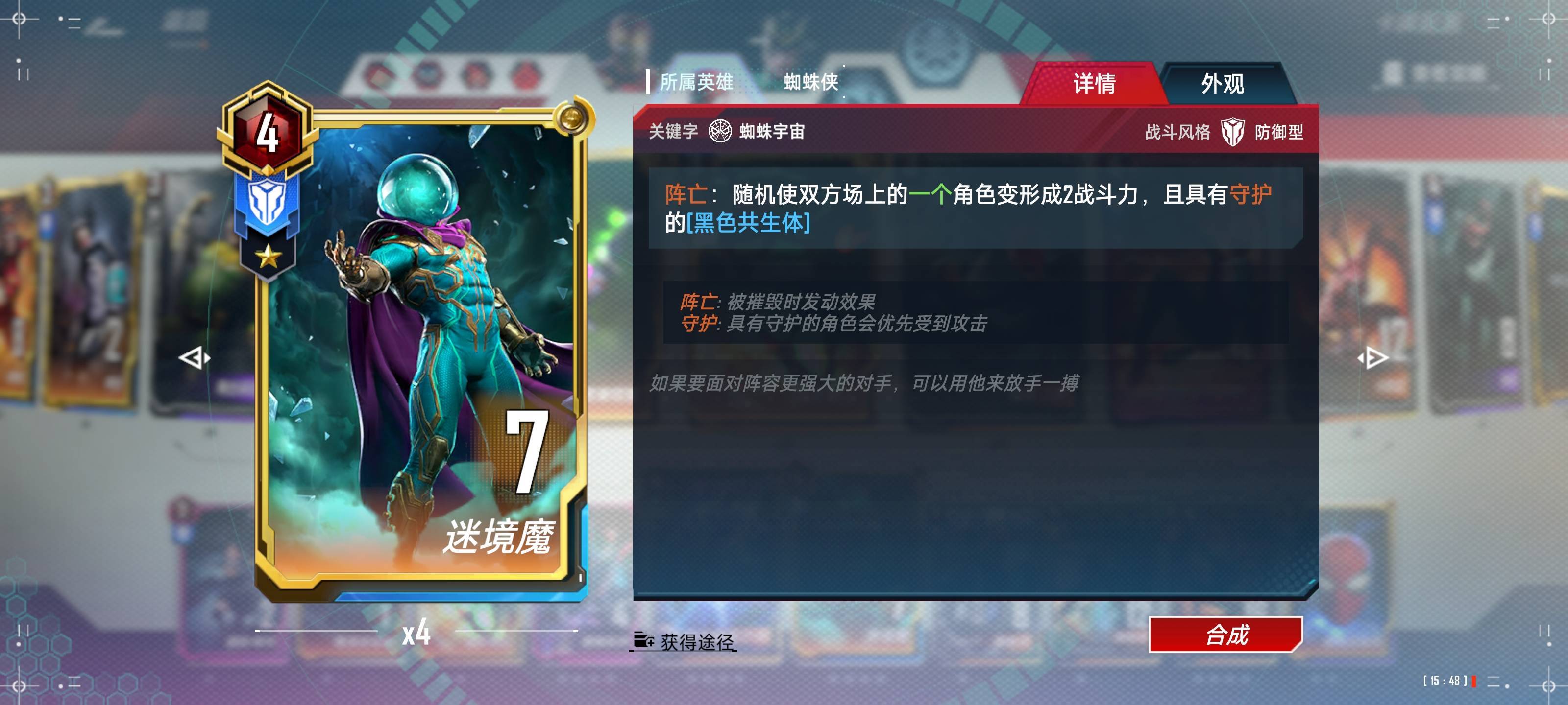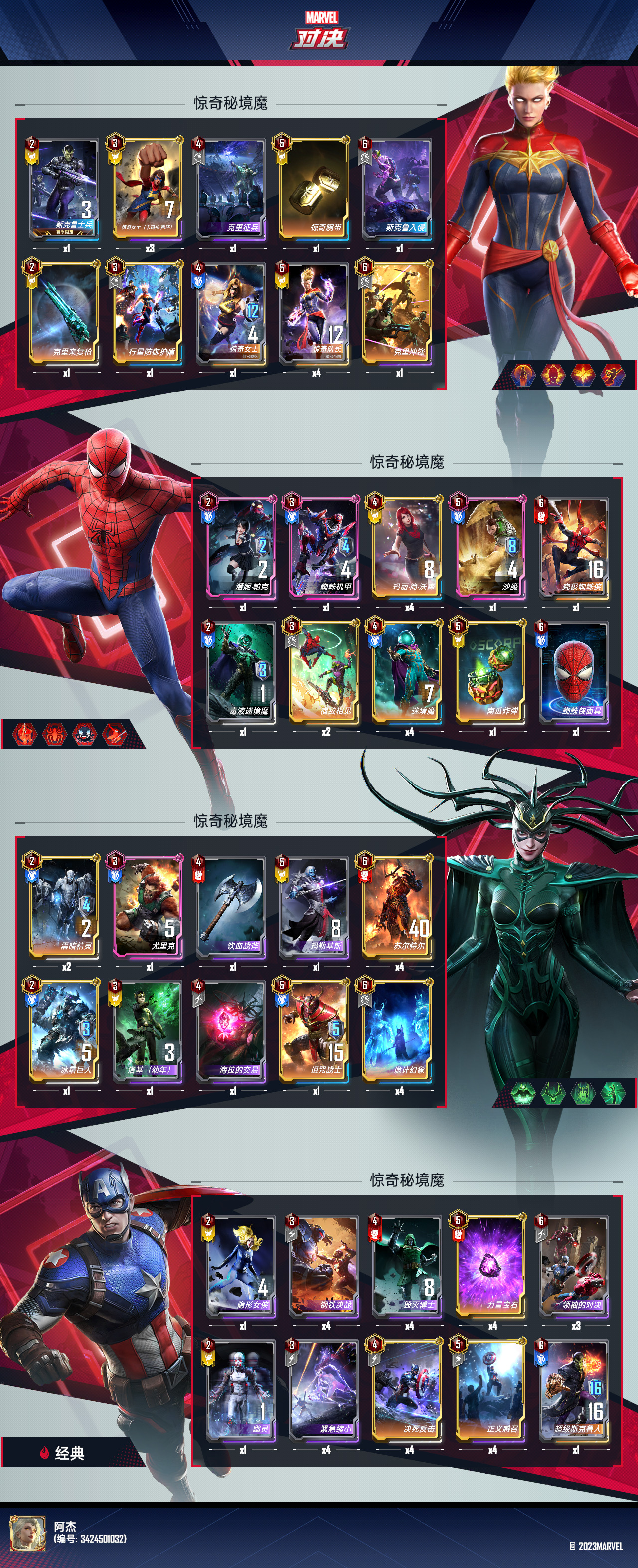 (一),蜘蛛侠组件: 1张蜘蛛机甲前期强度不用多说,配合女士链接。潘妮帕克(异界)可以带一张,不过不用贪,能扔就扔。宿敌相见两张够用。秘境魔四张带满,配合英雄责任可翻八星。究极蜘蛛侠1张即可,防清场神器。蜘蛛侠面具带1张