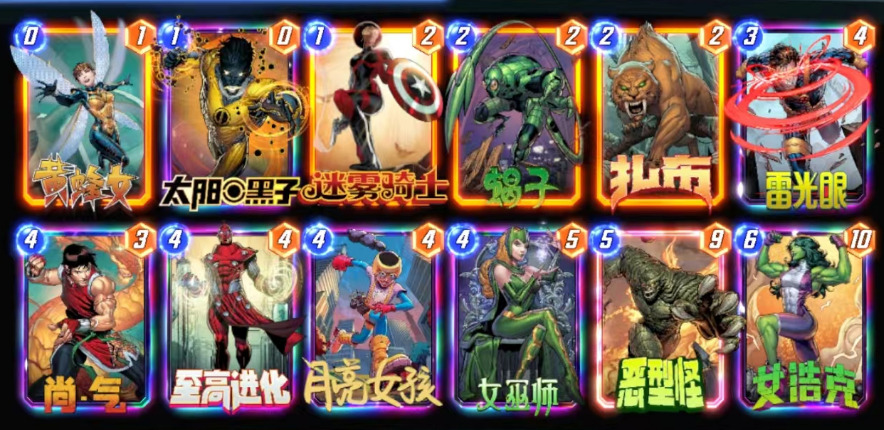 整套卡组的卡分为三种,一种是打手卡雷光眼、恶形怪、女浩克。一种是润滑组件,让卡组减费,对面减攻击,同时补一点点数。太阳黑子、黄蜂女、迷雾骑士、扎布、蝎子。还有两张针对卡,尚气和女巫师。月亮女孩是核心牌,专用复制恶形怪和女浩克。造价主要是一个女浩克、一个至高、一个扎布。至高应该很多人都有。扎布有对4费的减费效果,对套牌提升强度明显。