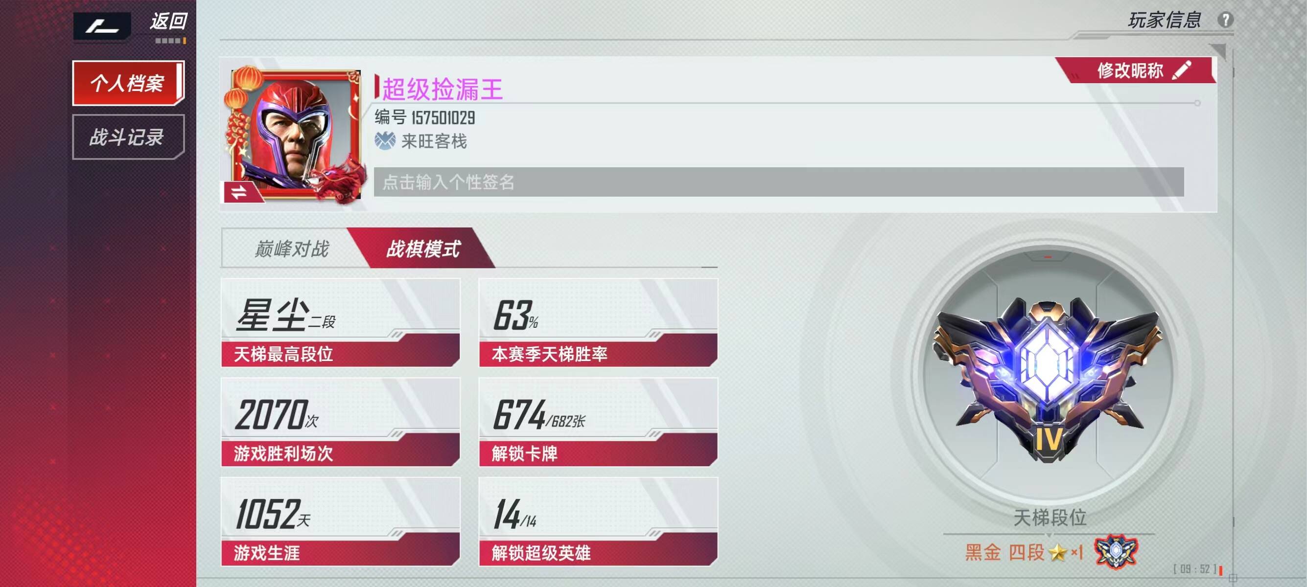 昵称:超级捡漏王 ID:157501029 每天都有清任务,从来没上过王,最高星尘,很遗憾