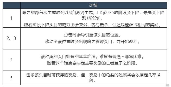 ※ 暗之裂隙不时会通过各种活动登场新的头目或是强化击杀奖励。