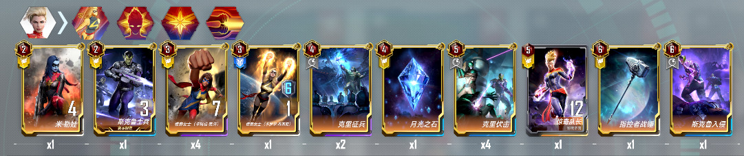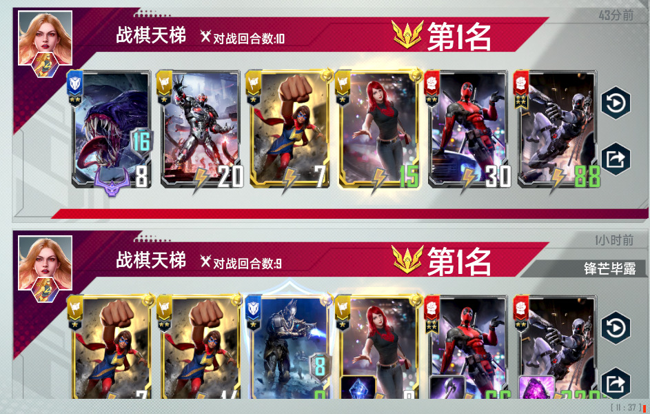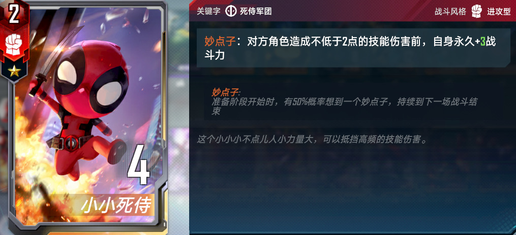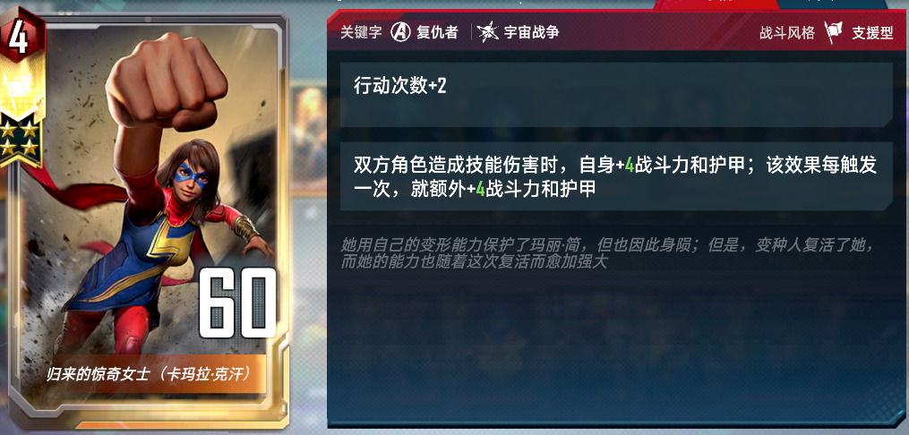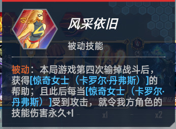 2.新四败技能【风采依旧】,四败后获得四星惊奇女士(卡罗尔·丹弗斯),且每次她受到攻击都可以让我方角色技能伤害永久+1,配合自带的一个惊奇女士,保底每回合可以+4技能伤害。而这技能伤害对死侍来说有什么用呢?请看VCR↓