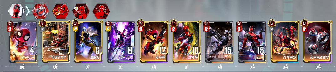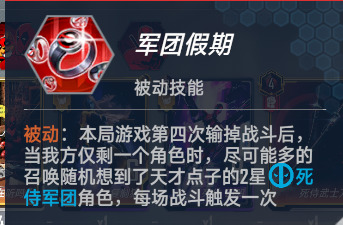 3.新四败技能【军团假期】,四败后剩1单位时可以拉满全场疯点子的死侍角色。经过试用,至少80%以上几率会召唤疯点子红死,配合其他召唤即可轻松砍10,后期一砍一个不吱声。