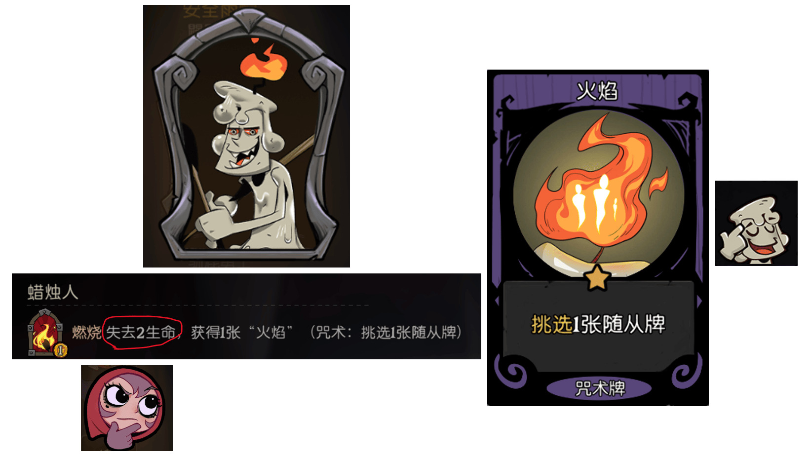 蜡烛人的技能花费是一枚金币,却能够直接挑选一张随从,可见强度非同一般,因此为了平衡,每次使用技能的时候会扣除两点生命。