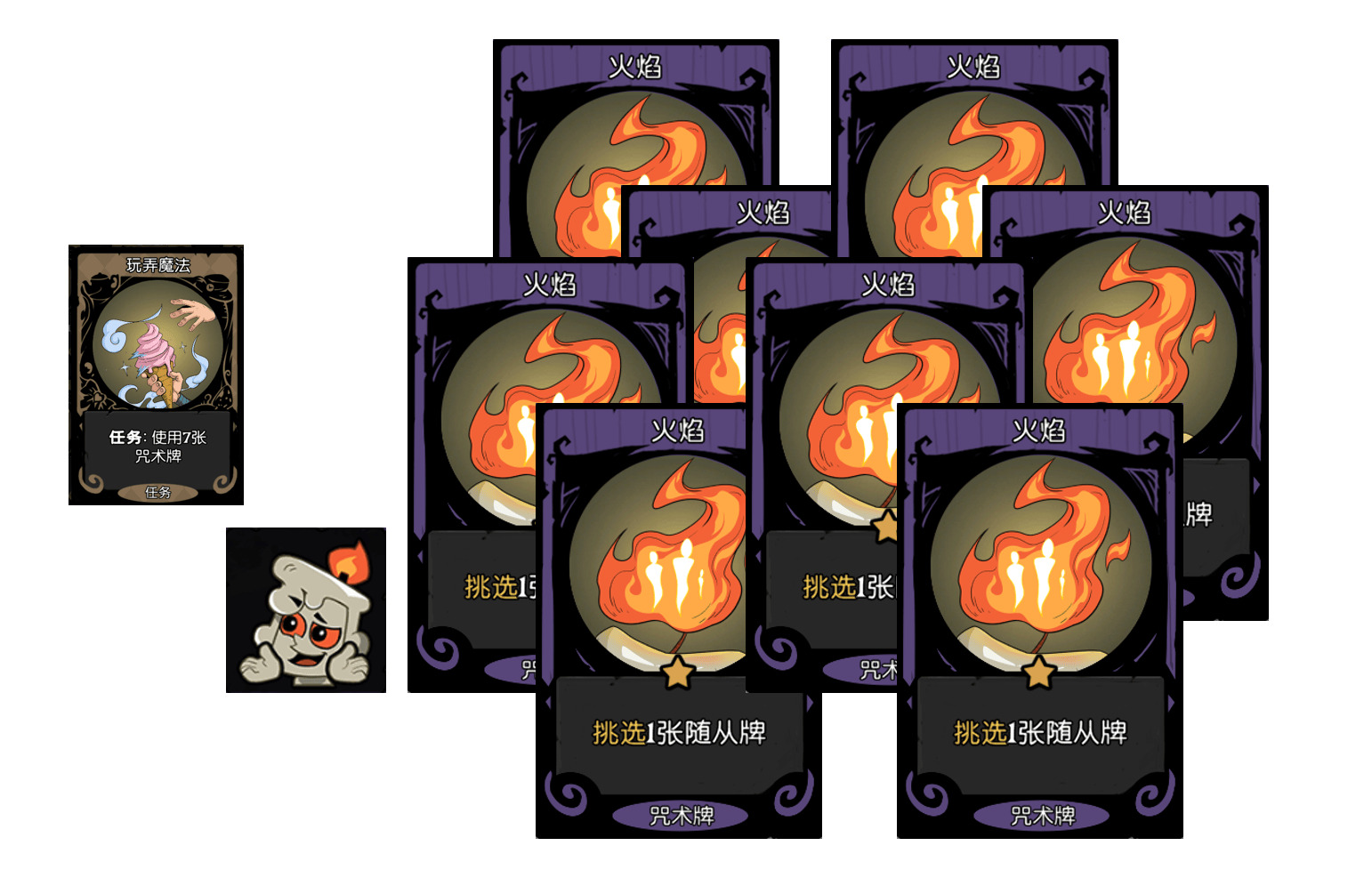 燃烧:失去2生命值,获得一张"火焰"(咒术:挑选一张随从牌)