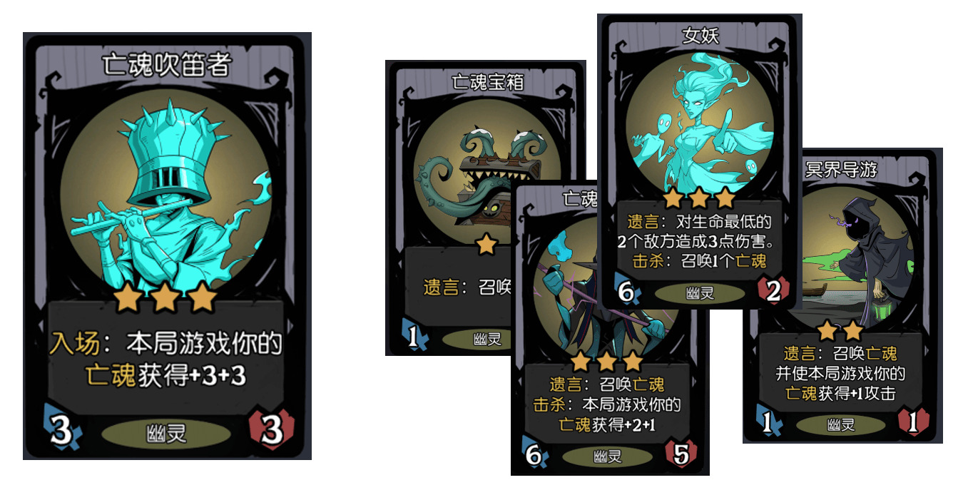 以养鬼为主,其中吹笛者的入场效果比较关键,在前中期给亡魂+3+3还是能有效避免掉血的,同时女妖单卡强度也比较高,在前期稳血作用非常大。