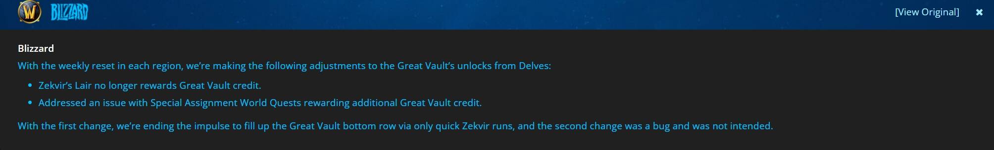 暴雪对泽克维尔的巢穴进行了修改,如今泽克维尔的巢穴将无法解锁地下堡低保,以下是蓝贴原文: