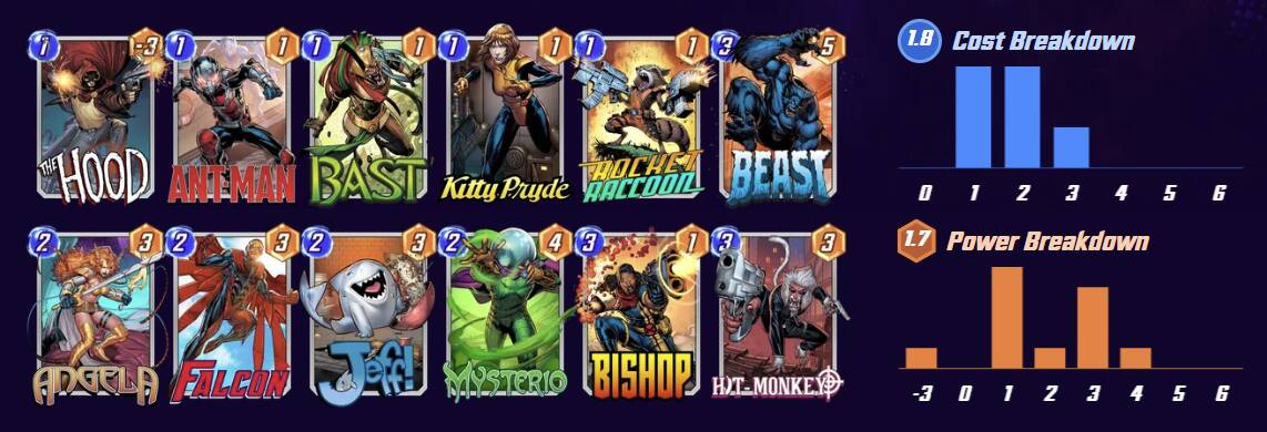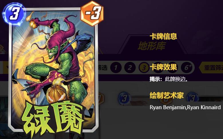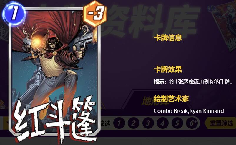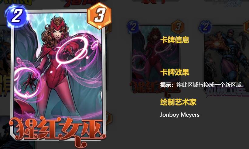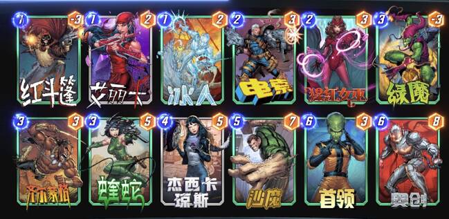 红斗篷搭配蝰蛇,在4能量时能造成对方-3战力,一个放牌位置被占据,并为自己增加5战力,形成巨大的场面优势。
