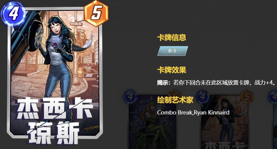 当你不确定使用哪张4费卡时,可以选择杰西卡琼斯,她可以4能量打出最高9战力。有的时候根据局势需要,5回合也可以下在杰西卡琼斯这,不要舍不得浪费4战力,有时候躲过了科斯默,可以出其不意。