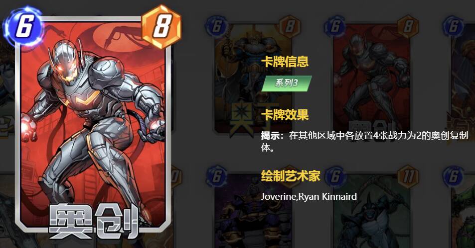 奥创能够适应各种地形,并且自身具有8点战力,非常强大。在对面下过卡扎尔或者蓝惊奇的时候要注意,如果对面也是奥创,小机器人会比你多1点战力,计算最后胜负的时候需要加上。