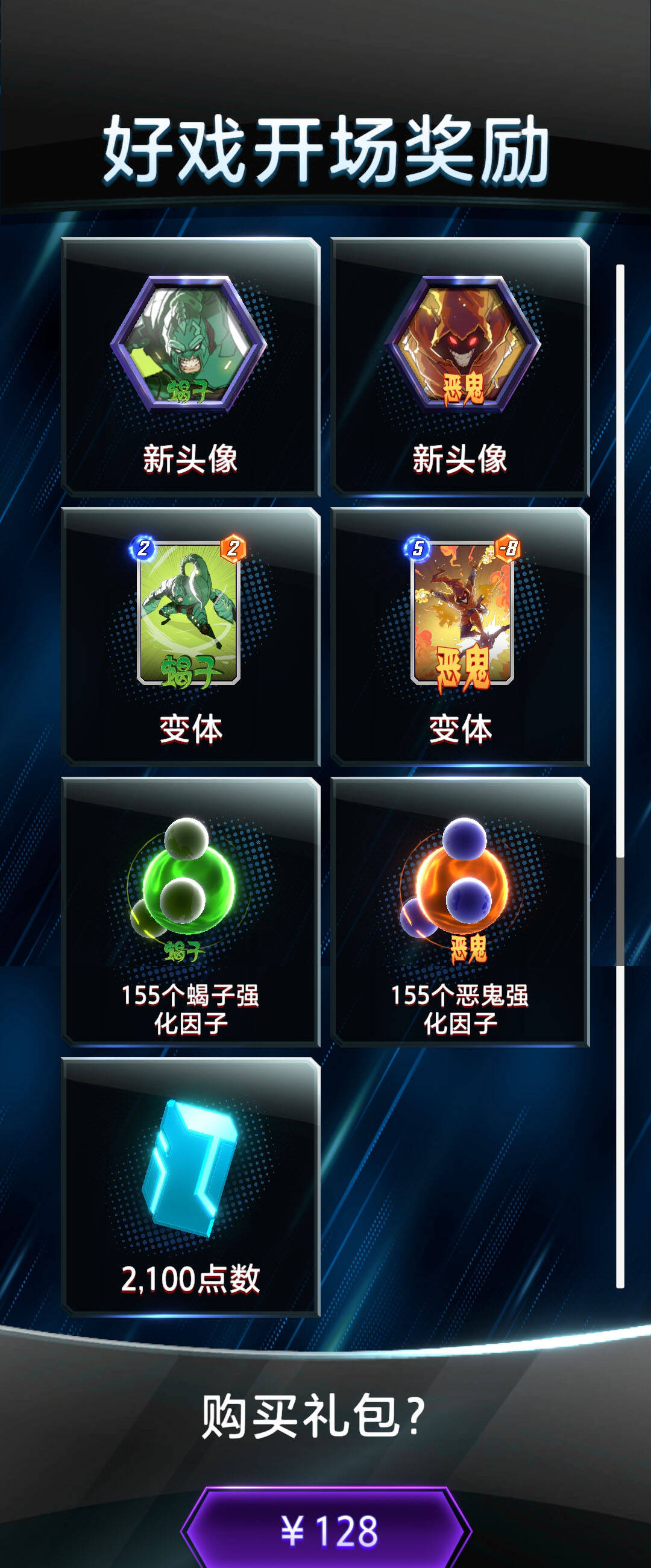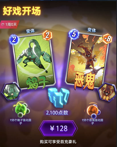首先来看‘好戏开场’礼包,售价128元,包含1张蝎子变体卡、1张恶鬼变体卡、2个头像框、2组155的强化因子和2100蓝点。