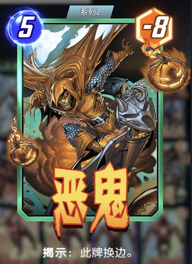 另一张卡牌是恶鬼。之前焦点宝箱推出吞星时,许多玩家使用恶鬼配合吞星。最初是单独使用恶鬼,后来发展到苏睿与恶鬼的组合,直接放置一个减少16战力的恶鬼,这很难反制。因为奥丁可以让恶鬼再次触发揭示回到对面,导致很多玩家被迫再次玩起了王白虎奥丁的卡组。另一个反制恶鬼的策略是加入一张卡耐基,这通常出人意料,对方可能认为这个区域已经稳赢了,但你可以在最后一回合仅用2能量就将其化解。