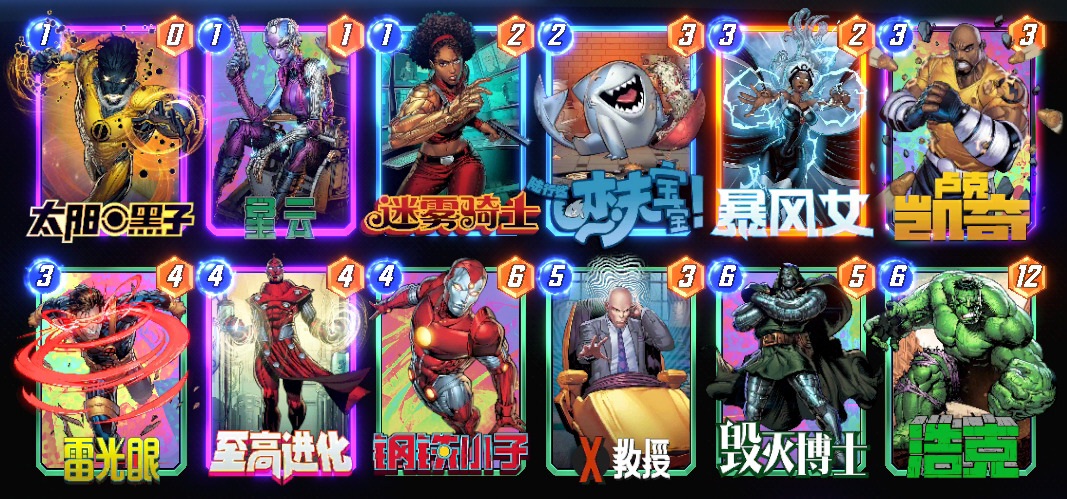 - 暴风女和X教授是控制锁区的核心牌,暴风女可以接雷光眼,每回合减对面2点战力,最后战力不足还有毁灭博士可以补点。
