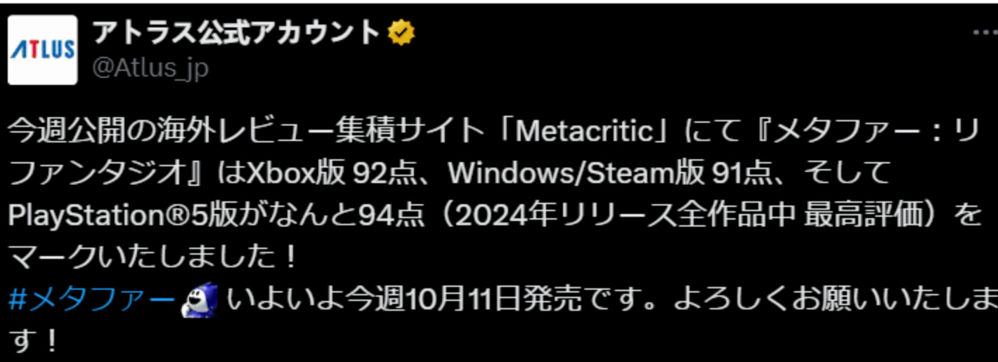 《暗喻幻想:ReFantazio》即将在10月11日正式发售,而该作的媒体评分也已经解禁,今日官方在推特上表示了对游戏的庆贺。