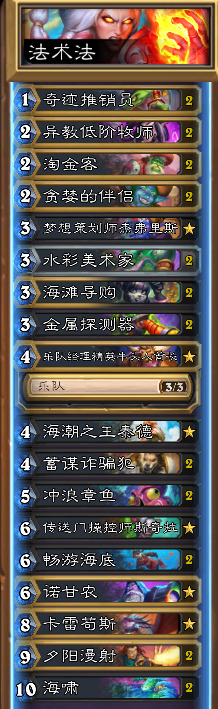 本套卡牌基本从黄金到传说没调整,根据不同职业留牌和出高费法术的方式也各有不同,但是总体因为结合法术法和法球法,所以启动方式有4种很是全面。内战的话,其实谁先手是有很大赢面的,整体思路最重要的是保证自己的节奏。因为牛里面有回荡,后期也是比法术法更强力,同时盗贼4费随再出阿曼苏,可以在即使对面有场面的时候斩杀对面。