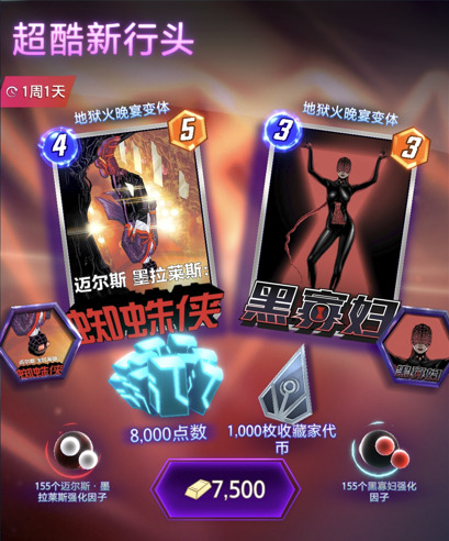 礼包售价7500金块,四舍五入相当于非双倍的648元。其中包含两张酷炫的变体以及对应的头像,两组强化因子各155以及1000代币和8000蓝点。1000代币等于1400金块,8000蓝点等于6400金块,这两部分加起来就相当于7800金块了。