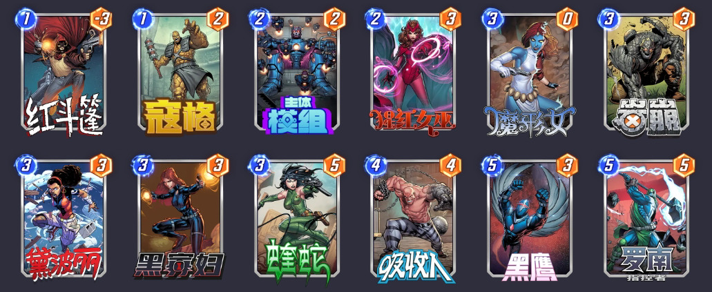 一套基础的黑鹰罗南卡组,用来体验塞对面牌库,手牌,场地,丢各种东西去对面的体验。追求更高强度就要换掉罗南、主体模组、红斗篷、蝰蛇、魔形女,换星云(冰人),毁灭博士,钢铁小子、杰夫宝宝、科斯默等。