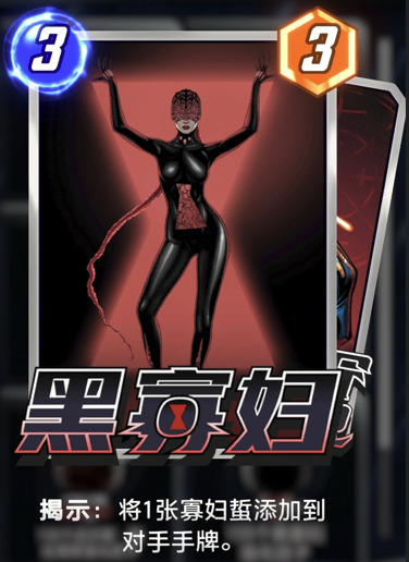 黑寡妇这张卡一般出现在黑鹰和罗南的卡组中,一些玩家为了针对海拉和法庭相关的卡组,3回合黑寡妇,4回合吸收人,就是不让你抽牌,除了开局天胡,后面要少抽2张牌,关键牌上手几率大幅度降低。面对战力点数扎实,不依赖关键牌的卡组时就很被动了,毕竟第3第4两个关键回合亏损战力。