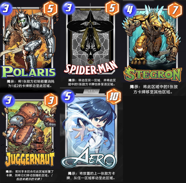 可以让对面移动的卡牌有红坦克、北极星、蜘蛛侠、史泰贡、气旋等,可以根据个人喜好携带。