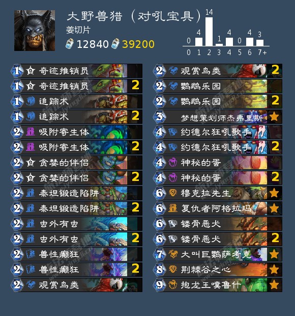 起手留推销员、追踪、观鸟之类的检索牌(奥秘里也有检索奥秘,很灵活,可以留),还有减费蛋,如果起手有减费蛋就留434,别留大野兽,遇到超级慢速卡组可以留荆棘心。核心思路就是尽快找到减费蛋然后触发,观鸟可以看看减费蛋拉出来啥再用。整体上还是控场为主,别着急抢血,对面就是60血dk也扛不住两波。如果拉出来的是穆克拉,就考虑怎么保怪,靠场面打前期压制。如果去拉出来的是吸血狗就控场,准备配合“观鸟+淤泥+虫外有虫”超杀偷鸡。如果是暴龙王那更是顶中之顶。最难受的是抽到鹦鹉,要是手里没其他大野兽可用,就直接拍出去复活减费蛋找别的野兽,别舍不得用。另外如果暴龙王只有一个就留好了别拿来打伤害,如果复制的够多就直接双暴龙王+下回合鹦鹉打出超绝压制力。到了后期鹦鹉和荆棘心就很关键了,因为鹦鹉复活的怪没buff,所以非血量紧张、战况危急,别选择复活狗子。手里实在没质量了也留着,等一个荆棘心,连续两波荆棘心下去连站带解基本就稳了
