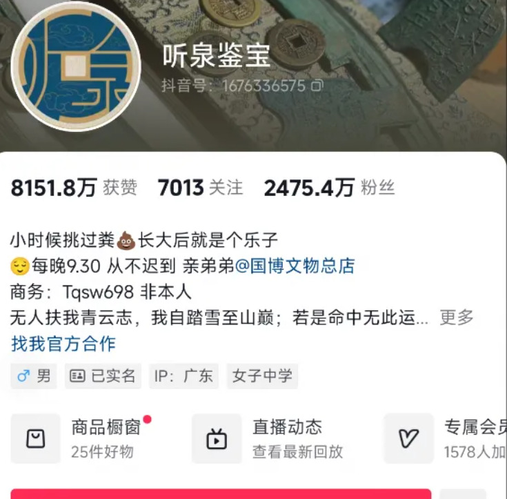 而有一个叫做《听泉鉴宝》的网络鉴宝节目,从去年开始,便火遍全网,今年半年内更是增长了1500万粉丝。