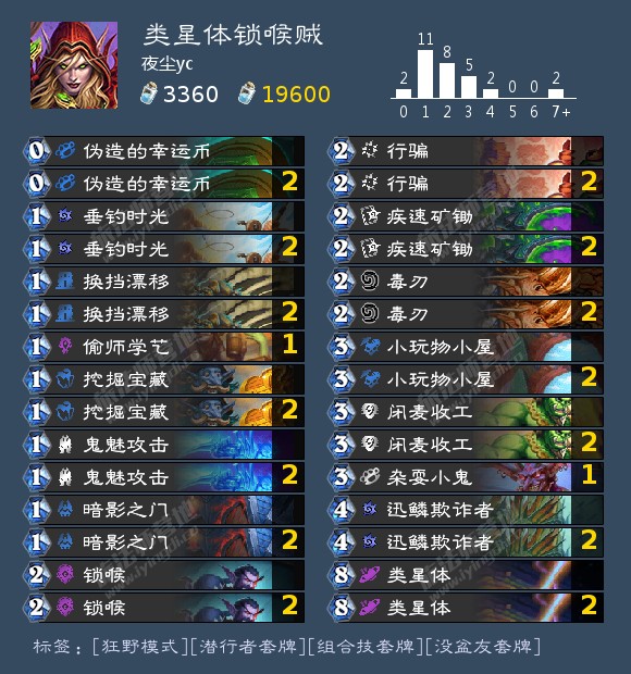 通过硬币,伺机待发,讯捷欺诈者等手段,三费/四费用出类星体,把牌库减到0费,无限过牌过光牌库锁喉otk斩杀对手,对面要是30血两张锁喉就够了,殒命暗影可以复制硬币之类的帮助启动,对面40血就复制锁喉,二费挂一个抽牌刀,三费类星体,然后a一下抽牌直接过光牌库斩杀,要是没抽到过牌,四费还能抽两张,这下一共抽了三张总能抽到过牌了,四费otk,强度大概和以前奇迹贼,点燃法一个水准,妥妥t1预定了