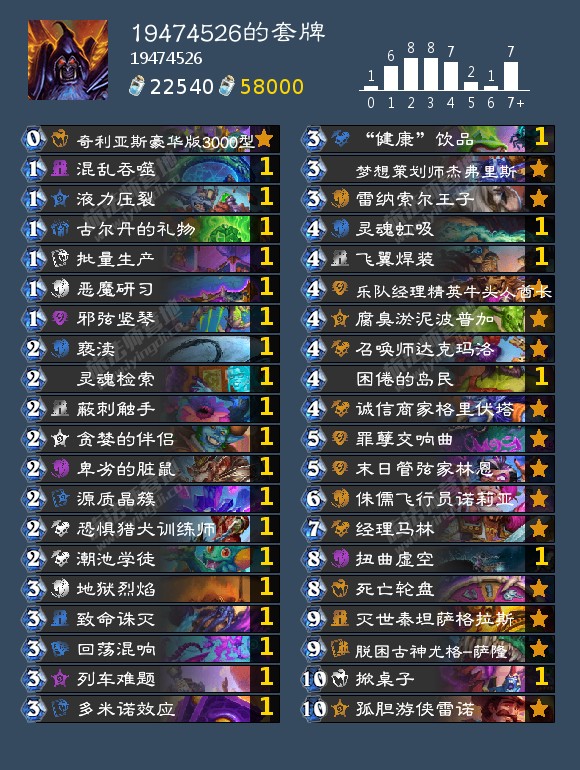 作为宇宙术爱好者 ,我也是在国服回归后玩上了,宇宙术 40卡组的回归也让更多小强卡得以加入宇宙术的前期节奏补强。这套的主要思路是前期进攻来骗出解牌或者辅助控场。 在中后期通过解牌 ,萨格拉斯等单卡带来的资源碾压对手。 备牌主要说一下恶魔研习和批量生产批量生产个人认为在40卡组里,牌库打空的特性可以有效防止鬼抽。 1费抽二过到的解卡比3点血重要, 还可以让林恩弃自己的时候不心疼。恶魔研习的卡池这版本十分万金油, 不少恶魔实战都有不错的用处。 还可以给飞翼焊装留坯子,以及加速卡组核心萨格拉斯的入场。死亡骑士 ,默认留脏牌, 牛里拿吃刀。 非宇宙可以直接用萨格拉斯压死 ,不过还是需要防一手德鲁伊。 前期不用刻意留aoe 注意在保留攻击能力的同时留脏牌 。宇宙德在我们场面运营正常的情况下还是容易骗出雷诺, 换出我们萨格拉斯的机会, 不过总体还是拼胡对局。大哥德的直伤能力一般, 多解几波就能赢, 林恩乐章撕掉一个大哥对面就少一个大哥大概率能拿下的对局。法师 默认40大大法起手注意留飞翼焊装, 诺利亚, 来处理第一波水人。前期的小怪铺场,可以消耗对面水人的进攻次数, 争取让开局运营的场面来让水人的进攻产生难度 。这个对局萨格拉斯无脑出 ,早一回合都是多一点优势, 裸拍牛倾向于吃刀,优先级大于脏鼠 ,卡德加容易给到很大的直伤压力, 法师很多时候节奏提供的压力根本不支持脏鼠再拉 ,主要靠控住法师的场面并且同时尽量回血赢 。战士拼胡度对局挺有说法,不过如果让战士完全自闭打出组合技就会相当难受。前期能够打进攻压力就打, 进攻所留下的场面都是脏鼠的资本。起手注意留轮盘, 战士前期一般没有压力, 对面准时铜须我们也不慌 ,有轮盘开轮盘。打出工头脏了,轮盘尽量逼出对面的雷诺 ,萨格拉斯入场压制也是很有说法的。补水战五五开 ,尽量降低场攻就行了, 解不掉就当看不见 ,让大解下场处理DH默认海盗瞎, 注意留解牌和前期曲线, 海盗瞎的强度来源于高威胁怪滚雪球, 而我们这套卡组对于处理类似的场面的手段相当充裕, 没输过术士, 默认快攻术士注意留解牌疲劳术看对面胡度 ,通过进攻给对面压力 ,劣开自残术注意留解牌调度, 不过在40血的情况下很不容易被几回合打爆, 优开 ,残疲术给我们的压力很小, 属于很容易吃分的对象, 剩下的笔者自己也遇得少不做评价。注:套牌原主是笔者平板的营地号, 第一次发帖不知道绑手机号才能发