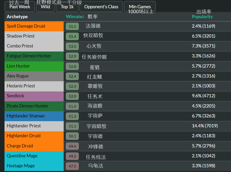 驴子网 过去一周 狂野传说前一千分段卡组数据(以1000场为门槛):