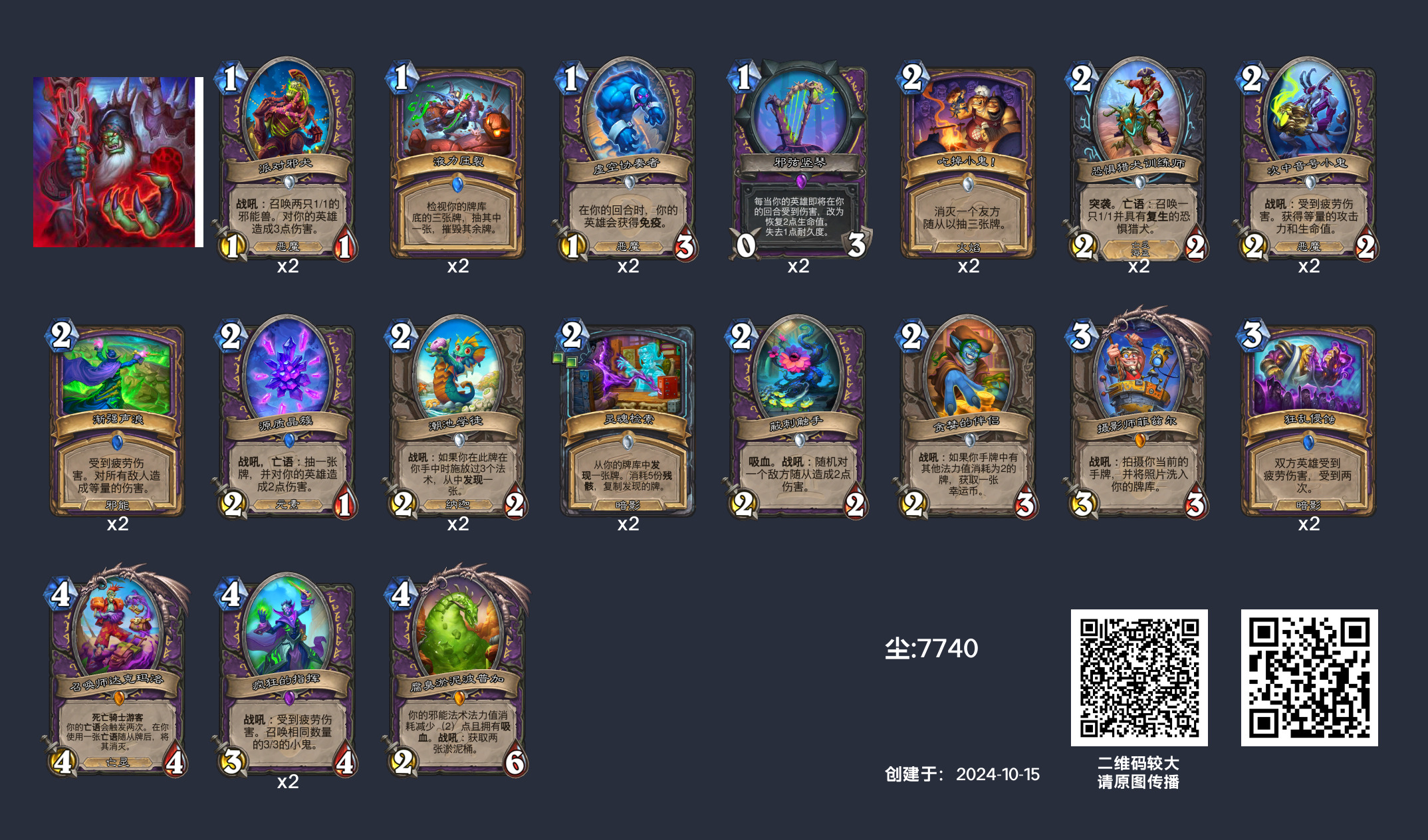 而且中低分段的快攻可能不会像高分段一样明显减少,所以老构筑里带的随从以及多米诺还是可以发挥一下的。至于伤害够不够打死40血,这个问题不用担心,只要你在疲劳和照片上投资的够多,老构筑疲劳术的斩杀线也是非常高的,实在不行也可以用照片学徒套娃给对面表演仙术。等到你觉得环境足够慢了,再根据自己的需求自行调整构筑就好。