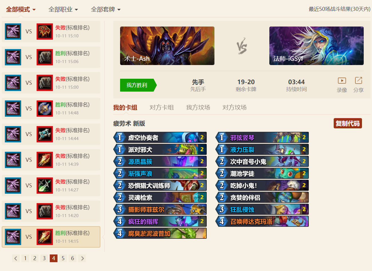 以下是我这套测试下来最终定型的新疲劳术构筑。我从大概国服300名出头开打,最后排名定格在84,整体的胜率大概在百分之65左右,下面我会从环境的变化出发,讲解这套修改后的构筑与原构筑的取舍。