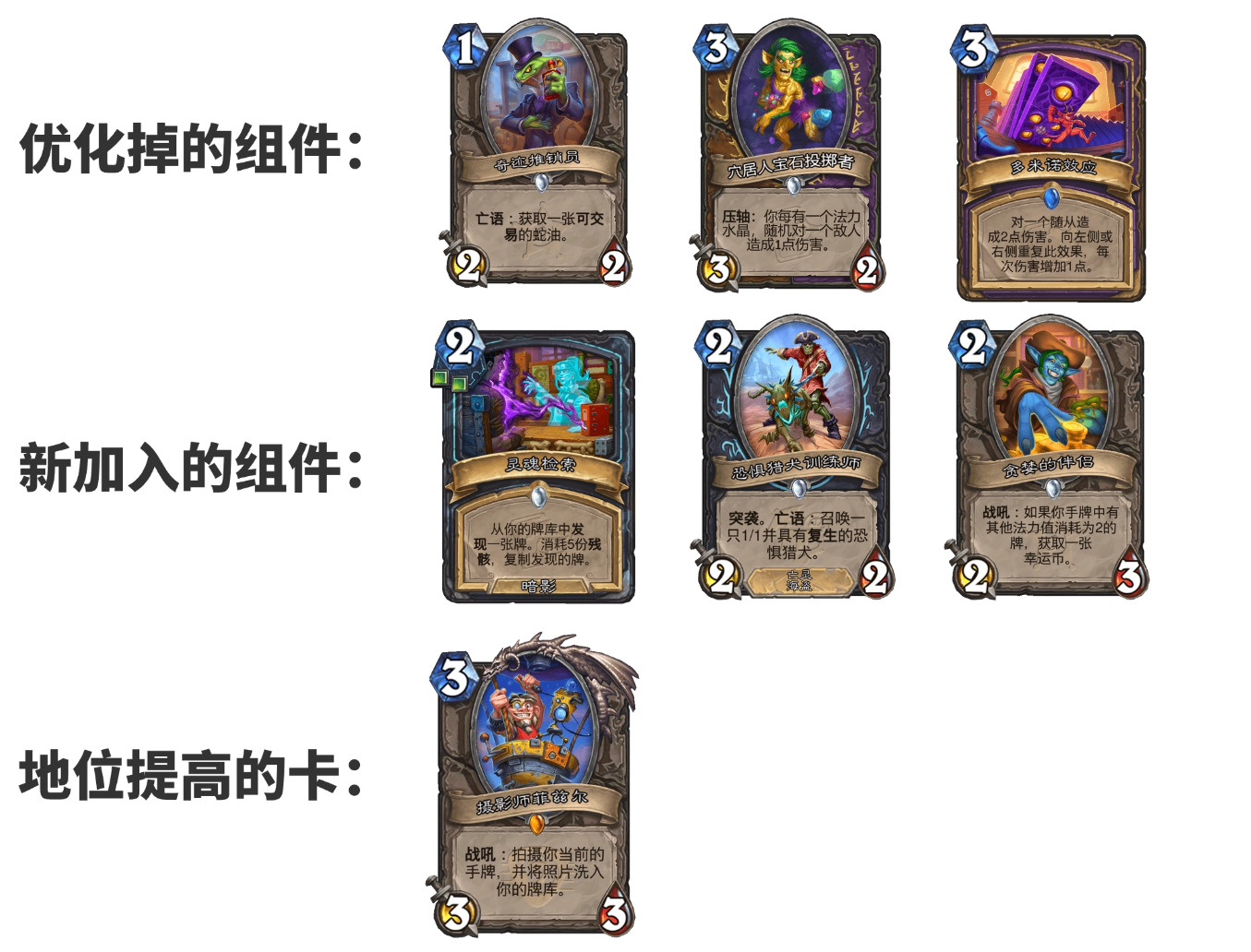 同时由于术士的构筑向otk靠拢,需要更强的过牌和卸手牌能力,所以亡语提供的蛇油很多时候就是负收益了。