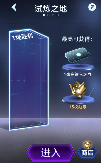 - 试炼之地模式,无需门票,胜利1场可以得到白银入场券和15枚勋章