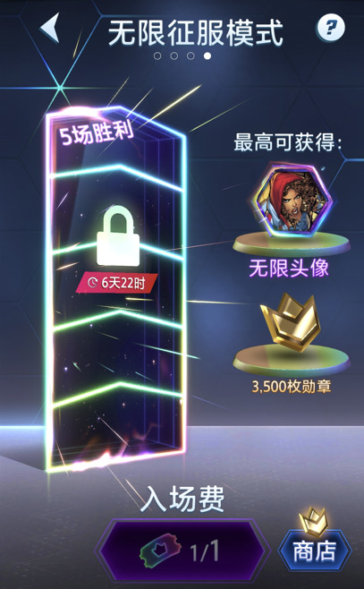- 无限征服模式,需要门票,胜利5场可以得到炫彩无限头像框和3500枚勋章。