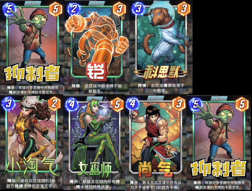 - 小淘气或女巫师,克制持续,比如莫比亚斯,黑鹰、罗南、钢铁侠,爱国者,塞拉,蓝惊奇等。