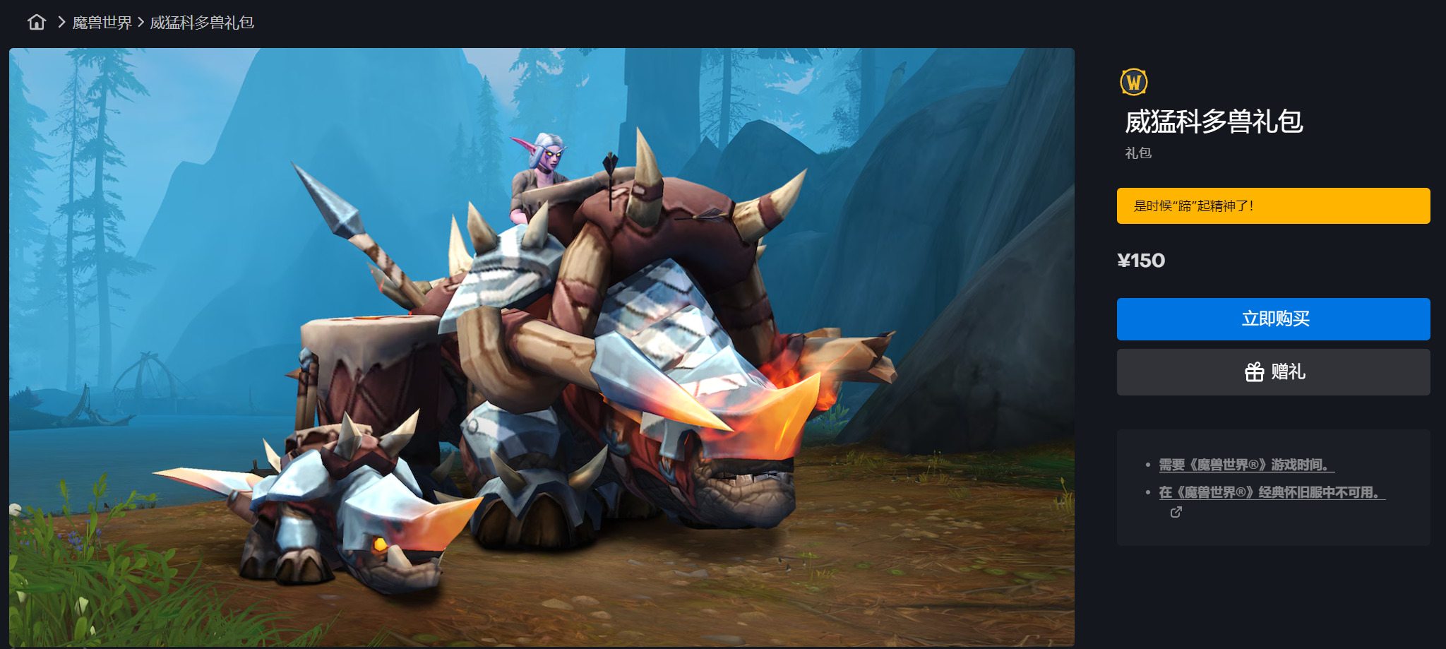 威猛科多兽礼包售价150元,包含一只宠物和一只坐骑: