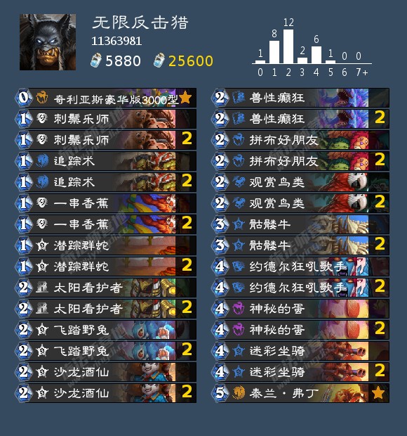(3)buff体系:整整10张,三分之一的卡组都是buff,各有用处:一串香蕉能反复用,贴给牛用来赖场,4+3可以拖延一下快攻的进攻节奏,也可以方便下回合贴坐骑;再加个野兔算是散装解场,在加攻没上手的情况下可以临时对付一下;兽性癫狂全体加攻,牛上手的情况2费癫狂3费牛4费坐骑可以让慢速极其难受,也可以给蛋加攻让蛋动起来,而且加攻后蛋给的也是加攻的牛,便于散装解场,斩杀回合兽性癫狂也可配合场面;观赏鸟类是发现也是buff,可以给蛋加攻让蛋动起来,或者斩杀回合找还在牌库里的牛,可以当小号咆哮用,当然大部分时候上手就用了不会留着,另外观赏鸟类找蛋的话微缩蛋也会加攻(周翔和谭涛最团结的一集),中期场面交换要注意一下;刺鬃乐师可以前期防一下,也可以在中期配合骷髅牛再叠一层,让牛更难被解掉;迷彩坐骑是中期赖场的核心,配合牛可以亡语生一个牛一个变色龙,羁绊选手也可以定向找回血或者圣盾/复生赖场。如果选游客体系,游客园林护卫者基利本身也是buff,配合狂吼歌手类似宇宙萨的三倍星空祈愿,可以造出法师根本处理不了的场面,也可以大幅提高斩杀线,但是要注意游客buff后的牛会非常难送。