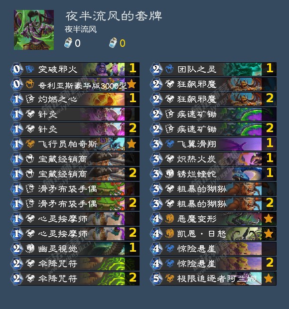 这是一套直接从营地抄过来的卡组,可以看到这一套没有我后来携带的AOE,也没有携带幽灵视觉,但是携带的卡牌也都能够起到打出伤害的目的。
