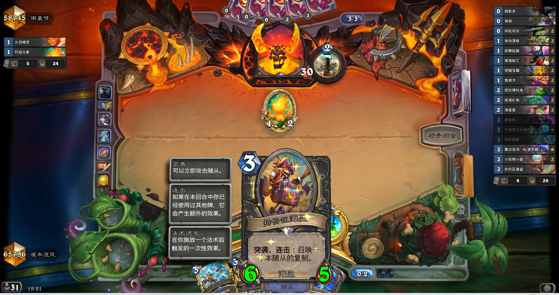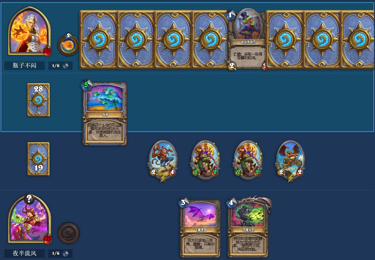 然而在实际游玩过程中,我总是希望灼燃之心能够帮我打出三点攻击力,总是希望火炮手能够打中敌方的脸,总是不做分析在一回合用地标召唤四个一一的海盗打敌方的脸,这些看似短期提高输出的行为,实际上从长期来看是不利于上分的,海盗瞎并不是要全部打脸,海盗瞎也不一定需要极限伤害,而应该根据实际情况灵活应变。