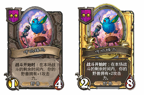 - 新:[1/4] 战斗开始时:在本场战斗的剩余时间内,你的野兽拥有+1攻击力。