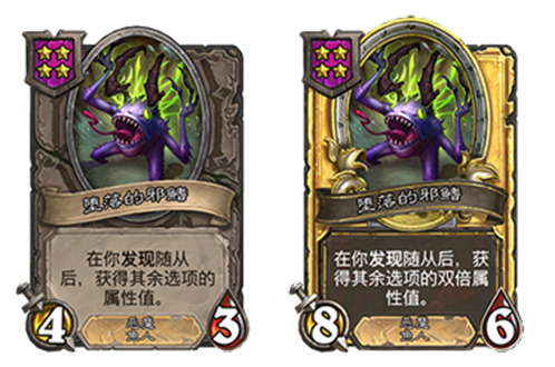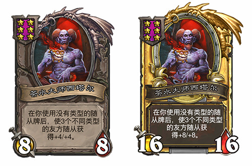 - 新:[8/8] 在你使用没有类型的随从牌后,使3个不同类型的友方随从获得+4/+4。