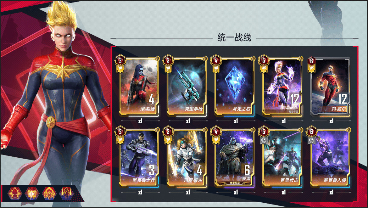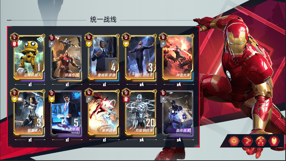 钢铁侠技能不重要,大多数时候不选,只有天才创造偶尔有用,在你没有4回合五本的时候可以用这个技能四回合四本找德拉克斯和罗南。协战装甲有点用,你恰好有可以带,我没有抽到,不然也会带着玩玩