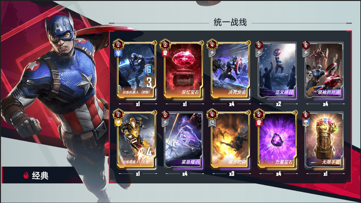 中期:找力量宝石烧卡,没有就用究极钢铁侠献祭(究极钢铁侠比较适合带4张,在没有力量宝石的情况下也可以给全体加12永久战力和4点临时战力),爆炸陷阱可以先拿一两张,这个时候还是优先刷新商店烧卡,比较顺就升六本