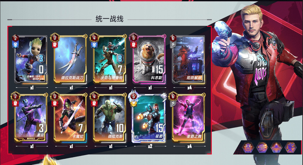 后期:如果对面是尸体,那能存事件卡就存,到决战一波打了。需要注意的是星爵虽然是先制卡和高贵的摧毁,但是打大多数后期卡组他没什么用(甚至还有副作用,比如神盾局),因此陷阱解除该用就用。星爵对技能伤害零抗性,后期需要保的只有新星和罗南,星爵死了刚好给物免然后把新星的战力慢慢翻倍翻起来。领袖对决也很关键,打傻大个很有用,记得把德拉克斯放在一号位让他被领袖对决摧毁,但是别打太多,指不定把新星摧毁了(