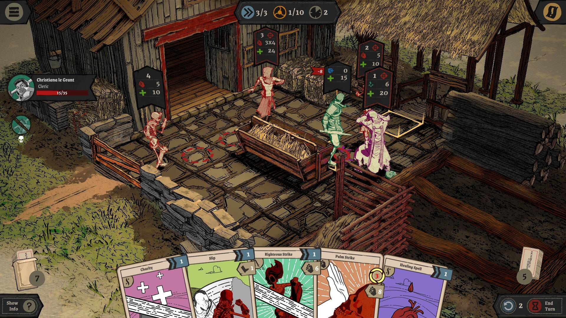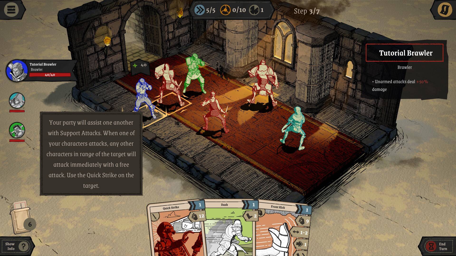 首先是游戏的基本战斗系统。本作可以基本概括为一款完全卡牌驱动的有地图的策略战斗游戏,角色的所有行动都需要由卡牌触发和实现。包括基本移动在内的所有动作都由对应标识的卡牌驱动,每回合玩家具有一定的基本费用,且随着Knight变为Knights,费用上限随之提升。此类游戏由于可操作角色不具备基本行动,所以笔者不太倾向于用战棋游戏的角度来认知本作,因为卡牌驱动意味着角色的位置、朝向等属于依赖地图的信息也不能独立于卡牌存在,游戏也因此不具备棋盘游戏的特征。