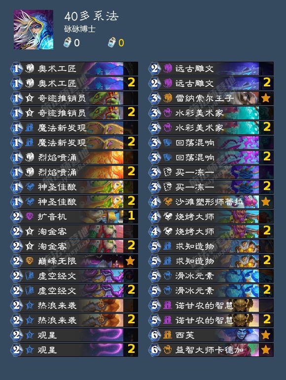 前期多打多发现不同派系的法术,根据对手职业或卡组找针对的牌,多混一混,如果有游客也可以铺场,注意不要爆牌,因为需要留 低费直伤组件(蛇油也是直伤); 中期靠滑冰元素、奥术工匠、求知造物以及发现的解场牌,做到控场叠甲解场(因为卡组中有很多发现 牌,这里就是考验游戏理解了); 后期靠双西芙甚至三西芙一回合斩杀,我最高打出一回合78伤害。