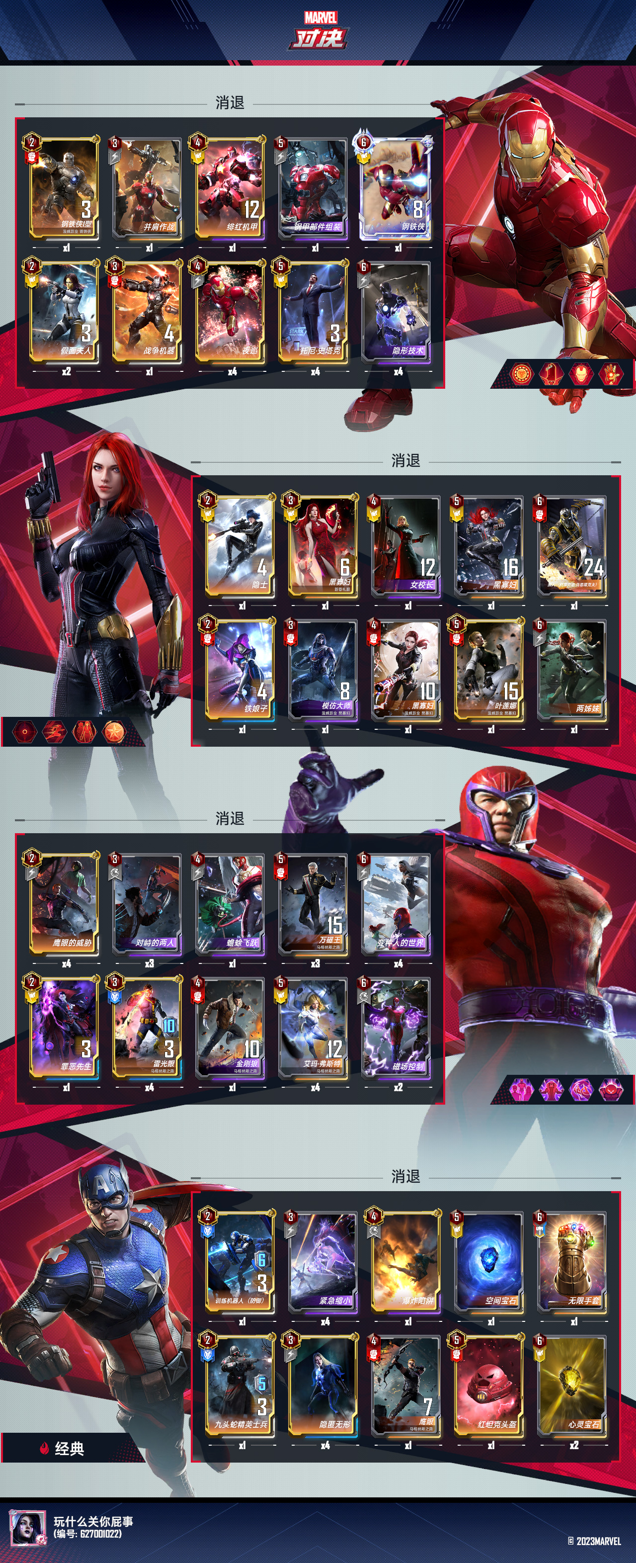6费:钢铁侠(可以换,但钢铁侠有时候确实有奇效)+隐形技术(这也是四张必须满的)