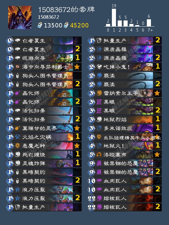1.不少卡组会选择塞一张批量生产到牛里来防游荡恶鬼,但我尝试过几把之后感觉这样得不偿失,批量生产1费扣3抽2越抽越多,无论是对于做任务还是给巨人减费而言都是很关键的,而对应的,首先不是所有卡组都会带游荡恶鬼,其次带了也不一定能抽上来,抽上来了,面对黑眼术的场面压力也不一定有时机拍,拍了也不一定能赢。你为这么一个东西去自降强度是没必要的。