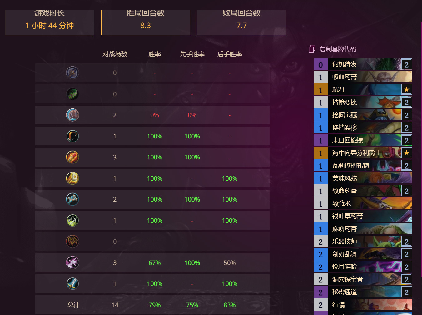 德鲁伊,碰到的有法强德和宇宙龙德。法强德比较好打,用风蛇骚扰,然后拖回合。宇宙龙德乱七八糟的怪和墙比较多,如果卡手的话会有点难打,但是对面宇宙卡组肯定有牌序不好的时候,55开吧。