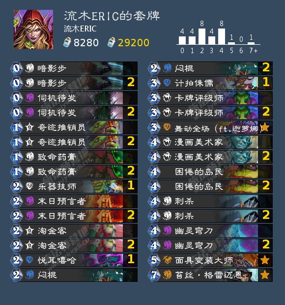 纯娱乐玩家,不考虑上分,第一次发贴,请多包涵。如有更好的想法,欢迎评论区集思广益。最近的龟龟贼很有趣,有种把战吼萨带回标准的感觉,但是实际操作起来感觉很卡手,基本上活不到启动回合,所以改了下卡组,加入了吸血刀的体系,抛弃了其他卡手的随从和几乎用不上的法术,核心是迅速启动,苟住前期。①抛弃了牛牛和八费的刺杀。牛牛几乎会浪费一个回合,八费的法术在变身前很卡手用不出去,变身后基本上就用苔丝了,也用不上。②加入吸血刀和一个找刀随从,两张药膏。可以苟住前期解决对面的随从,后期苔丝之后无限4攻吸血刀,清场回血好帮手。③冰片我个人觉得不好用,拖一回合之后还是解不了场,所以放弃了,改成了岛民+末日的组合,帮助拖一个回合,所以都满编。④其他基本上是过牌、找牌、解场法术。实测比较容易找到key牌启动。卡组: